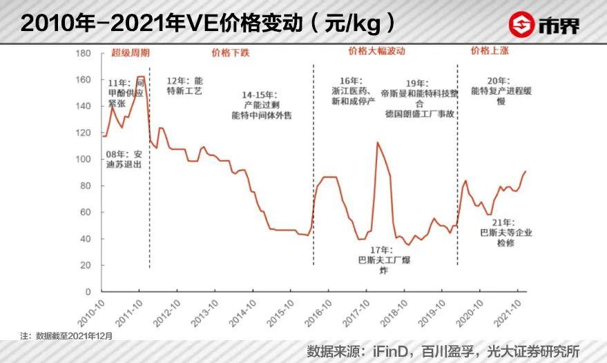 尤其是一系列突发事件影响下VE价格波动较大。比如2012年能特科技开发出一种新工艺进军VE市场,导致产能过剩价格下跌;2017年巴斯夫工厂爆炸等事件都是影响维生素市场价格的因素。