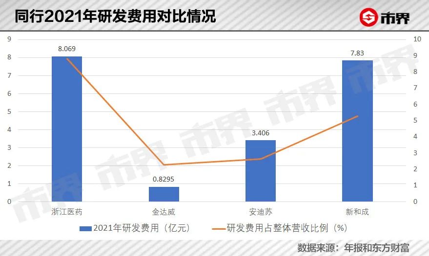 作为精细化工领域,想要成功突围,研发投入是必不可少的。但是与国际巨头巴斯夫年投入超过20亿元欧元的研发费用相比,2018年到2021年,新和成研发费用从4.57亿元增长至7.83亿元,占整体营收的比例仅从5.26%增长至5.29%。