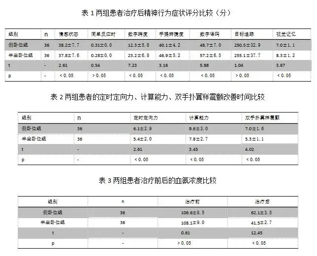 结论:综上所述,食醋保留灌肠治疗肝性脑病的效果显著,治疗期间采取不同体位所获得的效果也存在一定的差异性,半坐卧位临床疗效优于侧卧位,可明显改善患者的精神行为症状,且可缩短定时定向力、计算能力、双手扑翼样震颤的改善时间,降低血氨浓度。