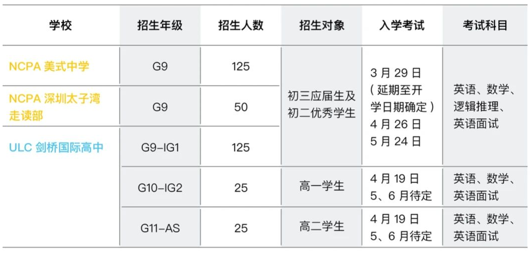 2020-2021学年,9年级与NCPA、ULC 联合招生;