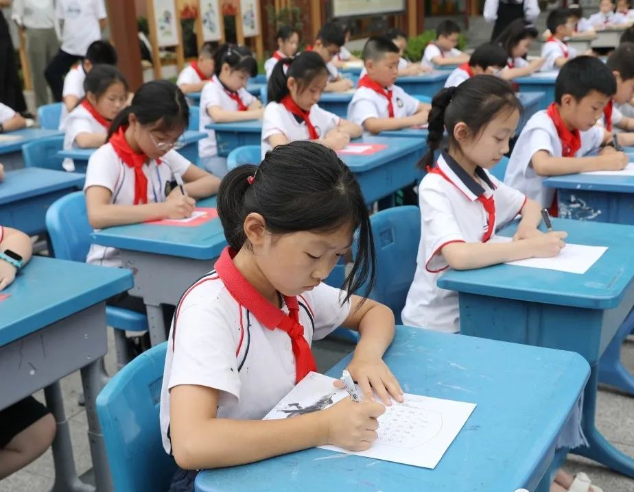 书写比赛开始了。首先进行的是四年级钢笔书写比赛和学校书法精英班软笔书写比赛。瞧,同学们个个坐姿端正,握笔正确,书写有力。写字前,他们认真观察每一个字的结构笔画;下笔时,他们沉稳自信,一个个规范而美观的汉字在笔下生成。同学们全神贯注地书写,一笔一画随着笔尖移动,起笔、运笔、收笔间流畅自然,笔随腕动,字由心生,一个个工整美观的汉字跃然纸上,弥漫着浓浓的笔墨之香。