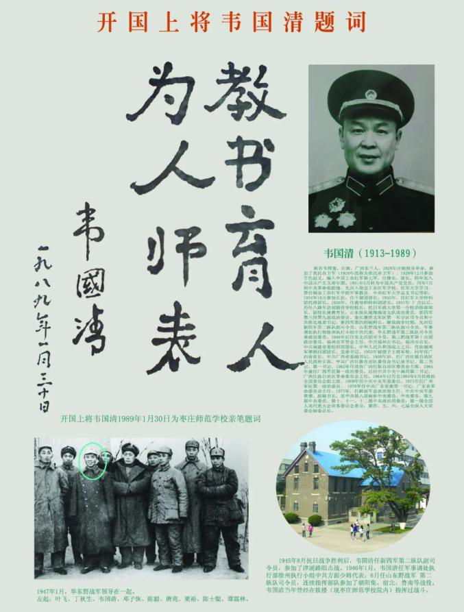 1945年8月抗日战争胜利后,韦国清任新四军第二纵队副司令员,参加了津浦路狙击战。1946年1月,韦国清任军事调处执行部徐州执行小组中共方面少将代表;6月任山东野战军第二纵队司令员,连续指挥部队参加了朝阳集、宿北、鲁南等战役。韦国清当年曾经在铁楼(现枣庄师范学校院内)指挥过作战。