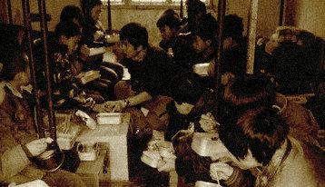 学生食堂非常简易,四周有砖墙但没安装门窗,棚子下是一个个垒砌的水泥板圆桌,没有凳子。那时的我们,每月有国家发给的补助,细粮粗粮是够吃的。每当吃饭时,值日小组的同学把排队领来的一盆菜、一筐馒头、一桶稀饭,一一分给本组的同学。