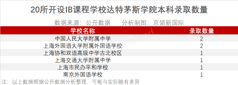 收到达特茅斯学院本科8枚offer的六所开设IB课程的学校中,中国人民大学附属中学和上海外国语大学附属外国语学校各收到2枚offer,上海协和双语高级中学古北校区、上海交通大学附属中学、上海市民办平和学校以及南京外国语学校各收到1枚达特茅斯学院本科offer。