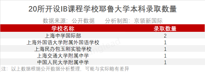 收到耶鲁大学本科6枚offer的五所开设IB课程的学校中,上海中学国际部收获2枚offer,上海外国语大学附属外国语学校、上海民办包玉刚实验学校、上海交通大学附属中学和中国人民大学附属中学各收到1枚耶鲁大学本科offer。