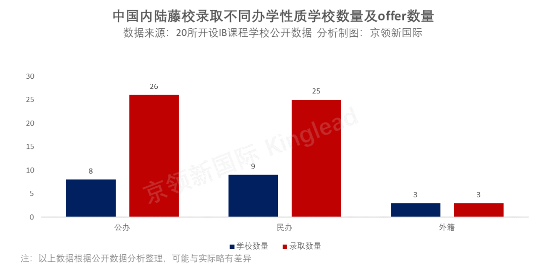 本次统计的20所开设IB课程的学校中,共有8所公办学校,9所民办学校,3所外籍学校收到藤校的offer。其中,公办学校收到26枚offer,民办学校收到25枚offer,外籍学校收到3枚offer。
