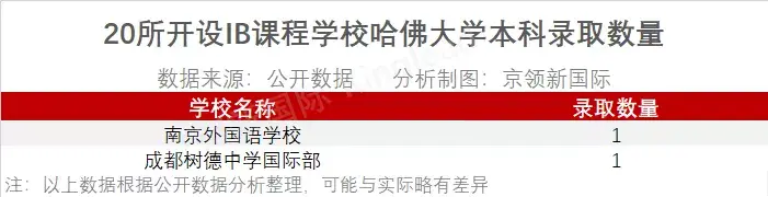 收到哈佛大学本科2枚offer的两所开设IB课程的学校分别是南京外国语学校和成都树德中学国际部,各收获1枚offer。