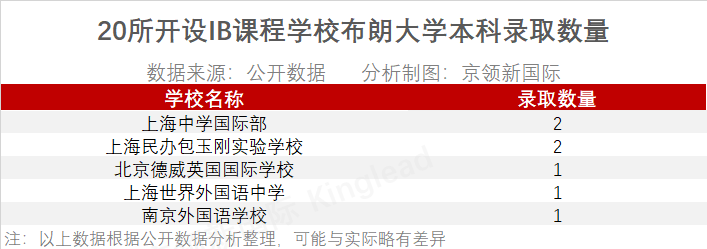 收到布朗大学本科7枚offer的 五所开设IB课程的学校中,上海中学国际部和上海民办包玉刚实验学校分别收到2枚offer,北京德威英国国际学校、上海世界外国语中学以及南京外国语学校分别收到来自布朗大学本科的1枚offer。