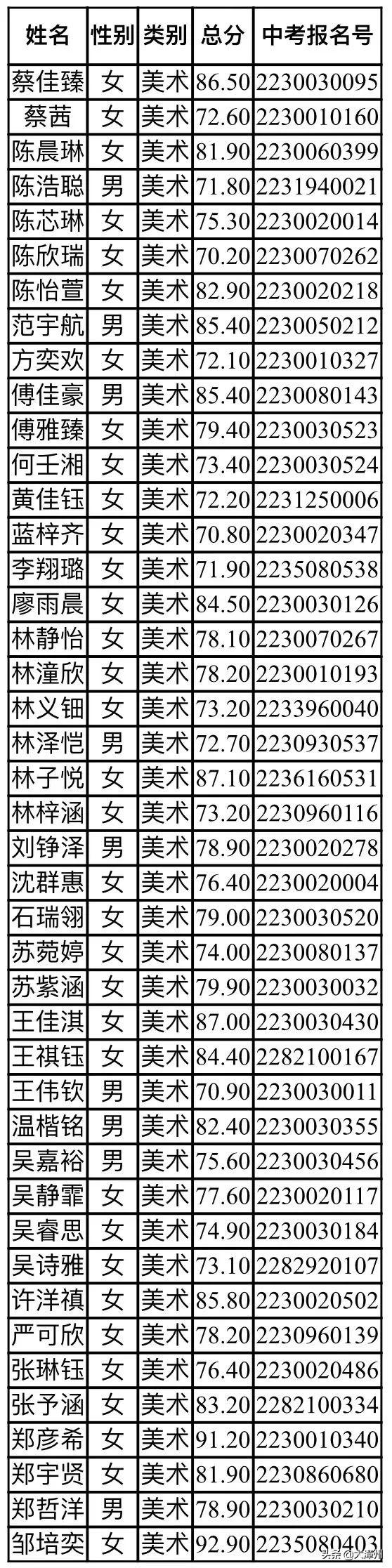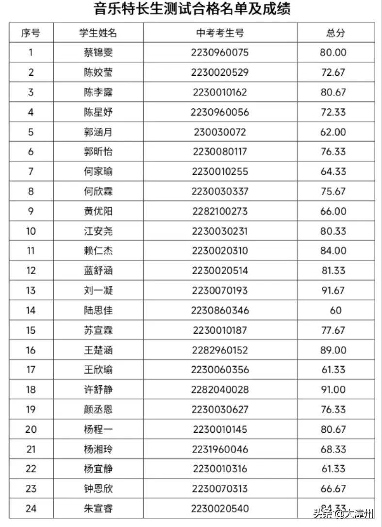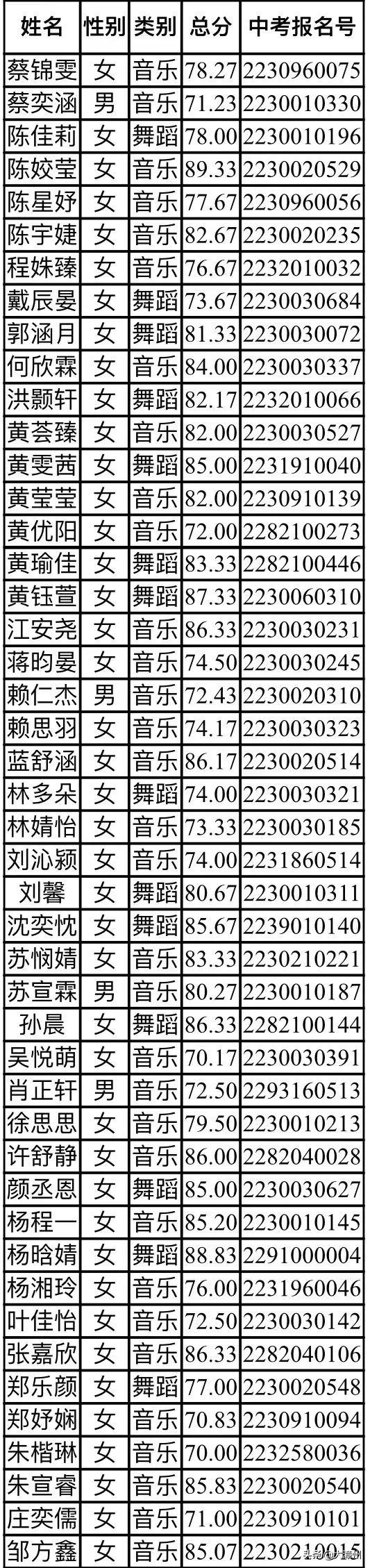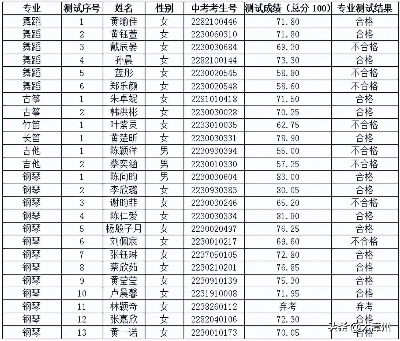 根据有关文件的规定,漳州三中高中艺体特长生专业测试已完成,现将测试合格考生名单公示如下: