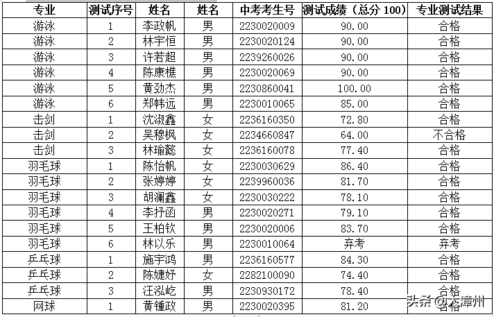根据《2022年漳州市第一外国语学校(漳州八中)招收体育、艺术特长生工作方案》中专业测试工作的安排,我校于2022年6月30日对通过报名资格审核的艺体特长生进行专业测试。现将2022年我校体育、艺术特长生专业测试结果公示如下,欢迎监督。