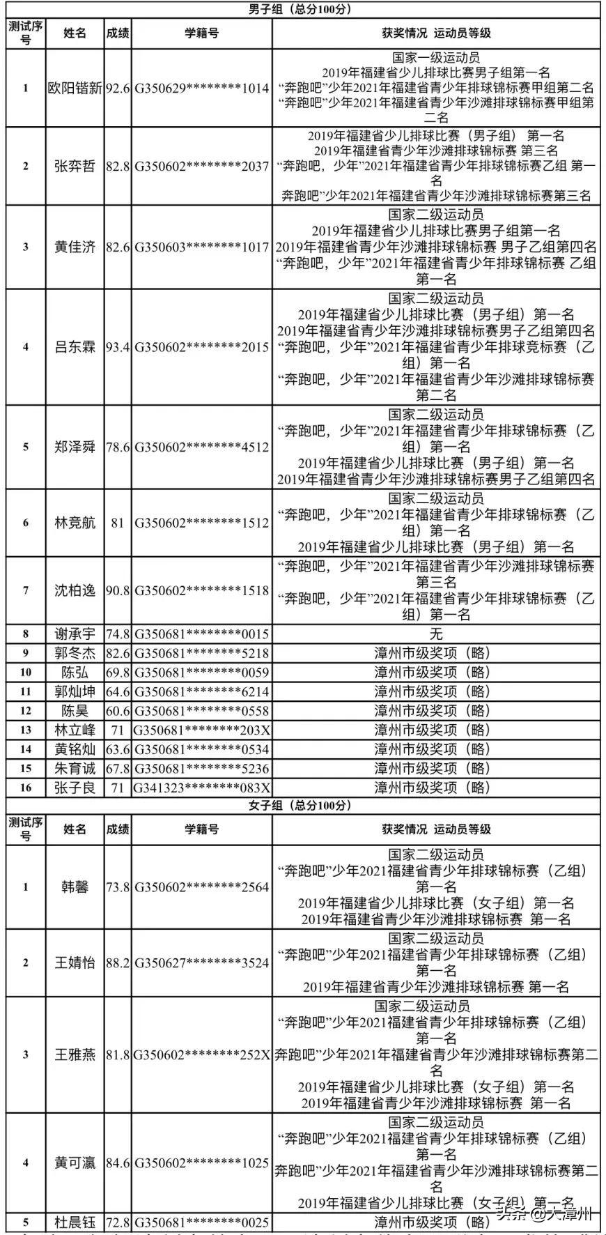 备注:根据漳州市教育局、漳州市体育局联合下发的《关于进一步做好我市中小学校优秀体育后备人才特招工作的通知》(漳教体〔2002〕136号)规定,凡属我市户籍在校就读的应届中小学生在相应学段,获国家级(含教育部、国家体育总局)体育竞赛个人前六名或集体前六名主力队员;或者获省级(含省教育厅、省体育局)体育竞赛个人前三名或前三名主力队员,予以优先、免试录取。优先录取的免试人员数原则上应计入学校的特长生总招生计划,体育特别优秀的学生(特指国家一、二级运动员和国家、省集训队运动员等)经过市教育局审核批准后可不占招生计划。