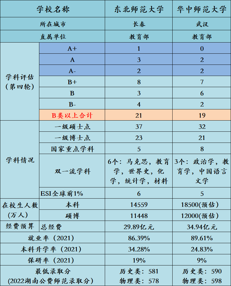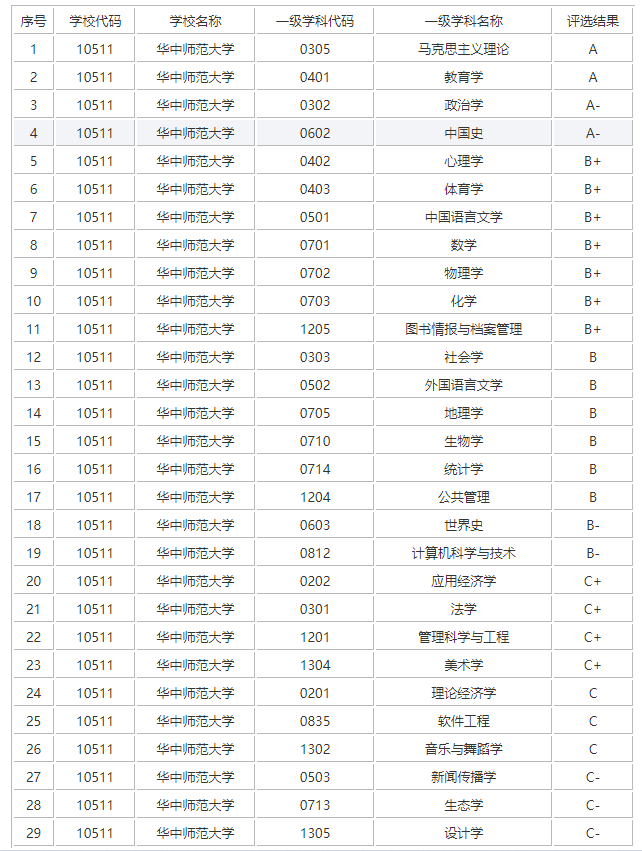 华中师大则共有4个A类学科,分别是2个A,2个A-,15个B类学科,分别是7个B+,6个B,2个B-,B类以上学科共19个。