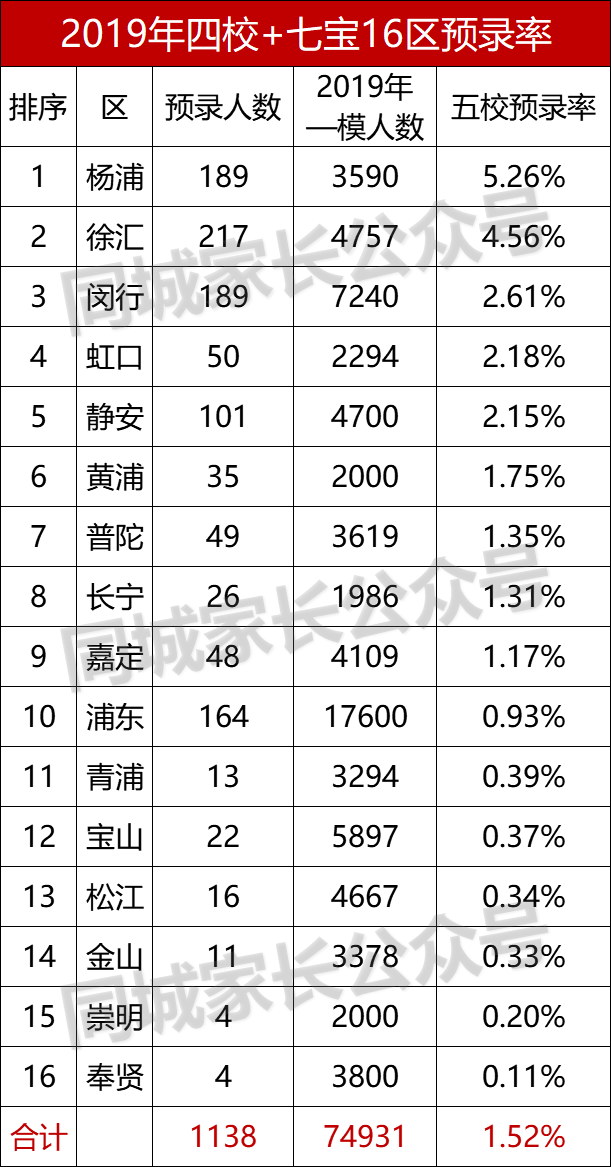 由于2020年预录取数据不全,今天就根据2019年上海各初中四校+七宝的自招预录人数,对各区的初中的自招录取率进行盘点,供大家参考!