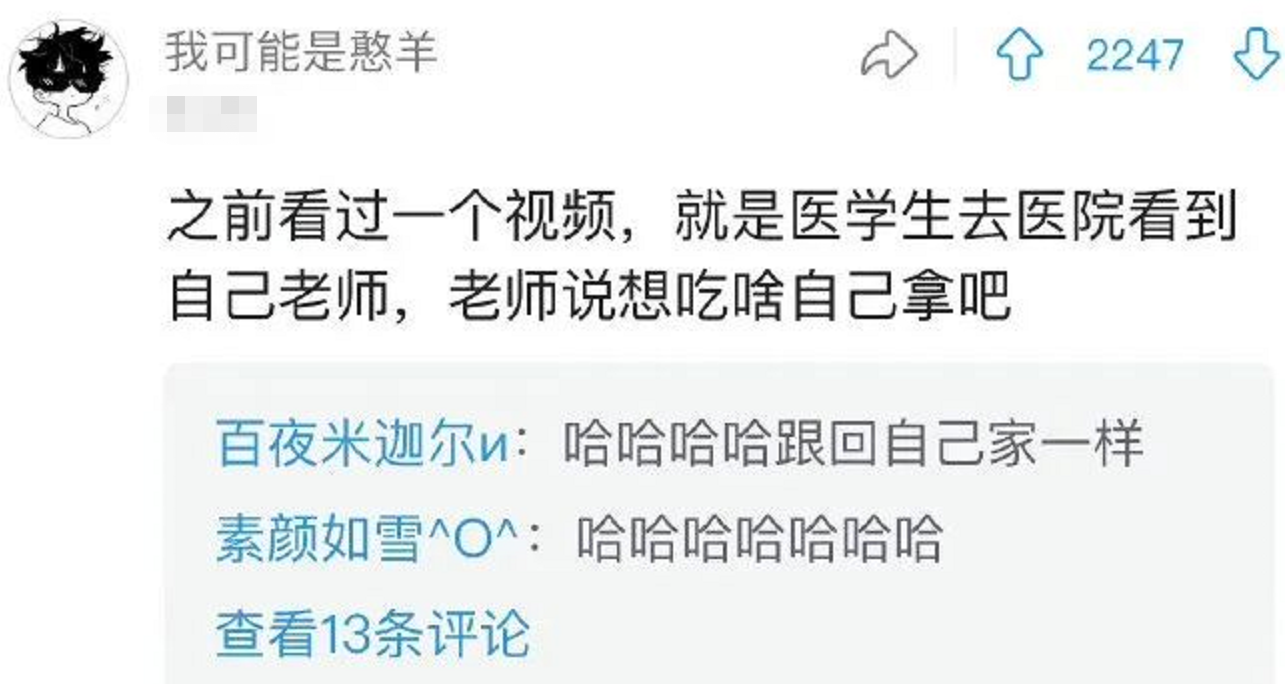 遇到了专业课老师,场景自然是很亲密的,甚至一位医学生还被老师亲切地告知说你想吃什么药,自己拿就好了,相信你肯定对自己的病情有判断力。