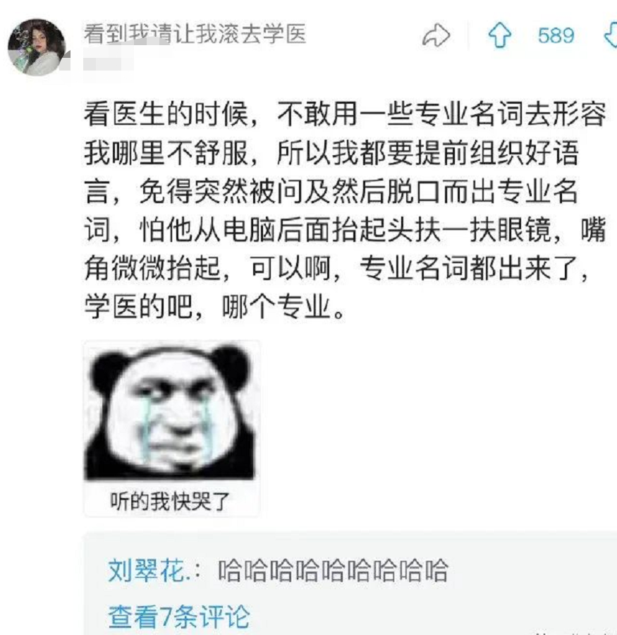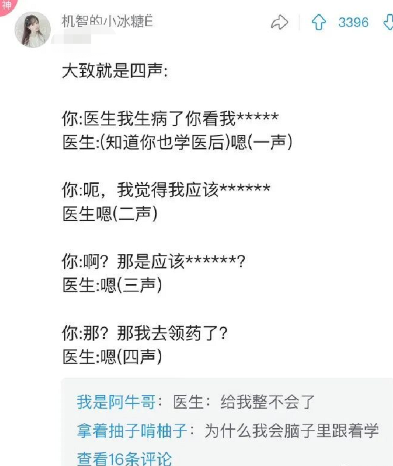 有不少医护专业的同学都在网络上吐槽过自己看病的搞笑经历,而且还发出了这样的忠告,说一定不要暴露自己的专业。不然你就等着被医生们考吧。