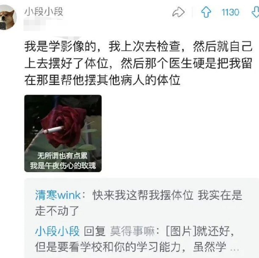 而前一学生进入医院看病的时候,也经常能帮助医生做一些力所能及的事情,比如一位学医学影像的同学,就帮助其他病人摆体位,是妥妥的得力小助手。