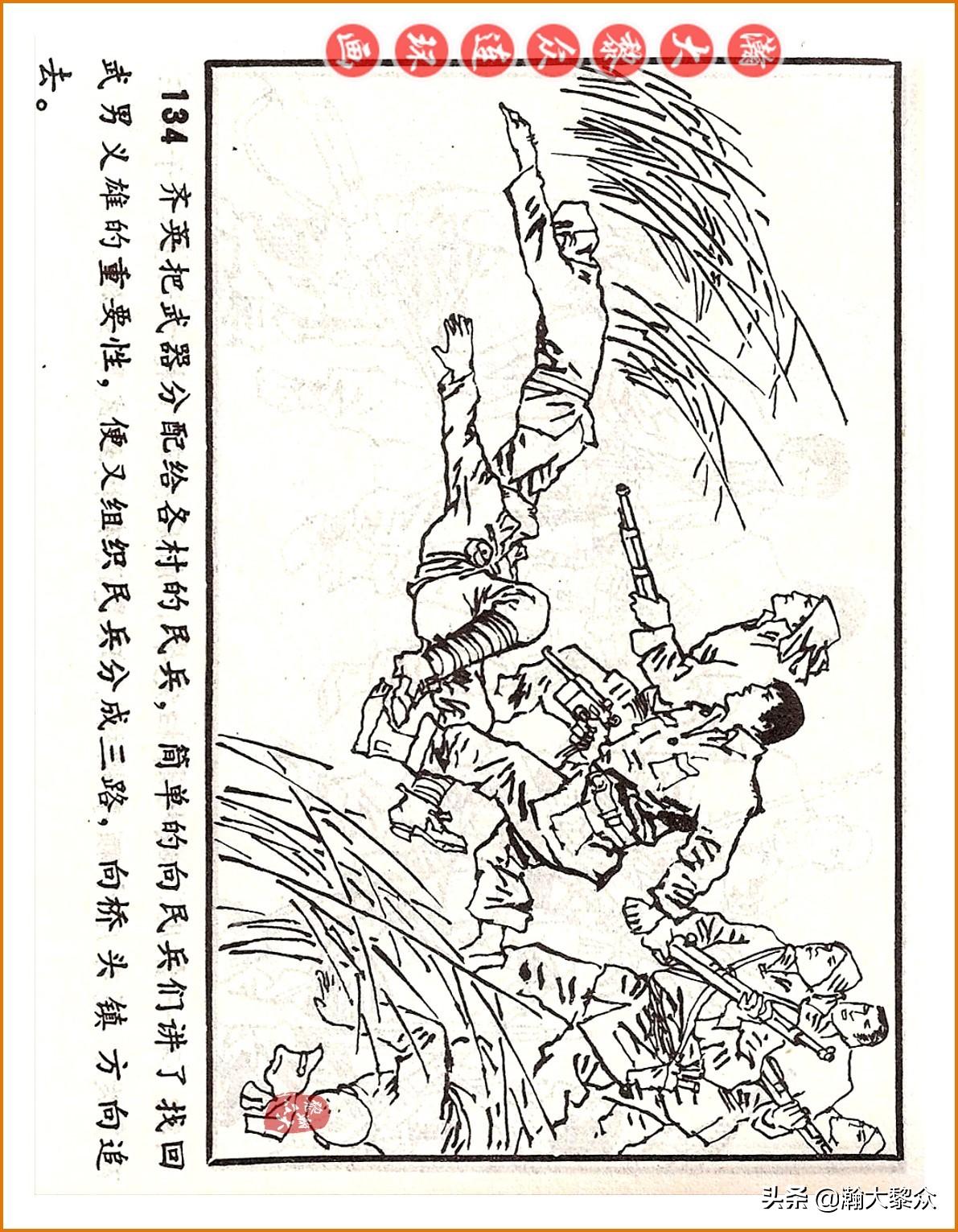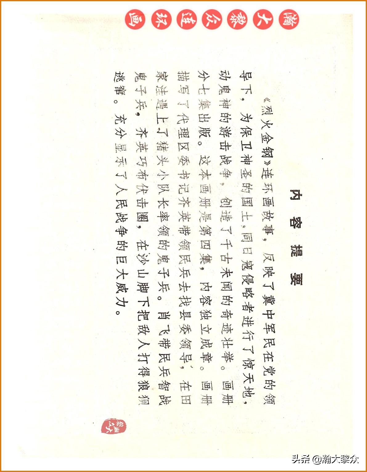 内容提要:《烈火金钢》连环画故事,反映了冀中军民在党的领导下,为保卫神圣的国土,同日寇侵略者进行了惊天地,动鬼神的游击战争,创造了千古未闻的奇迹壮举。画册分七集出版。这本画册是第四集,内容独立成章。画册描写了代理区委书记齐英带领民兵去找县委领导,在田家洼遇上了猪头小队长率领的鬼子兵。肖飞带民兵智战鬼子兵。齐英巧布伏击圈,在沙山脚下把敌人打得狼狈逃窜。充分显示了人民战争的巨大威力。