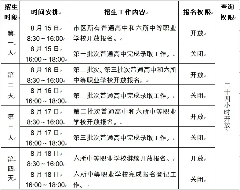 其中普通高中招生在8月15日至17日三天时间内进行,在录取时间内各校的指令性(含定向生和非定向生)和指导性招生计划同时完成。中等职业学校招生工作与普通高中工作同步开始,8月18日完成网上报名登记工作。