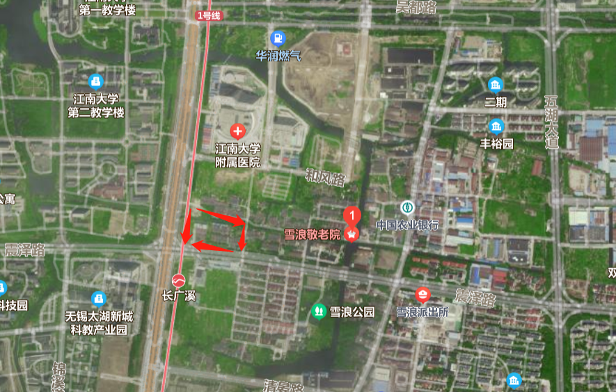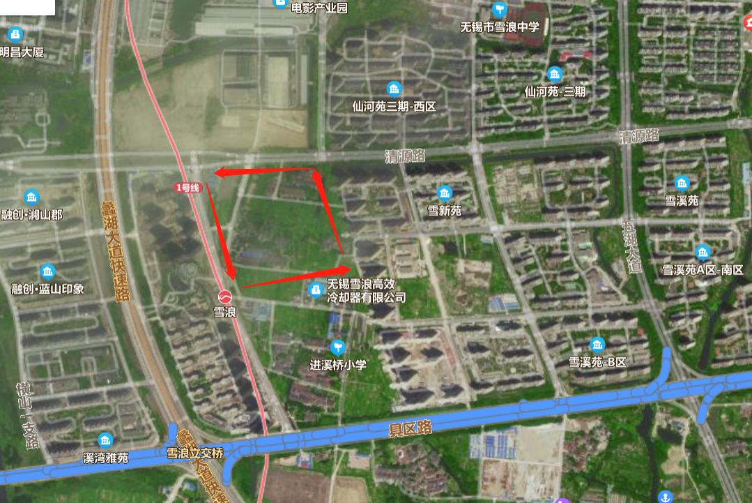 地块就在1号线雪浪坪站口,1.5km分布产业园、影视基地、公园等配套设施,距离江南大学仅2站地铁,可10分钟到达,1km范围包括溪湾雅苑(新建小区)及雪新苑、仙河苑等小区,周边则包含融创文旅城、绿地天空树商业街等配套。