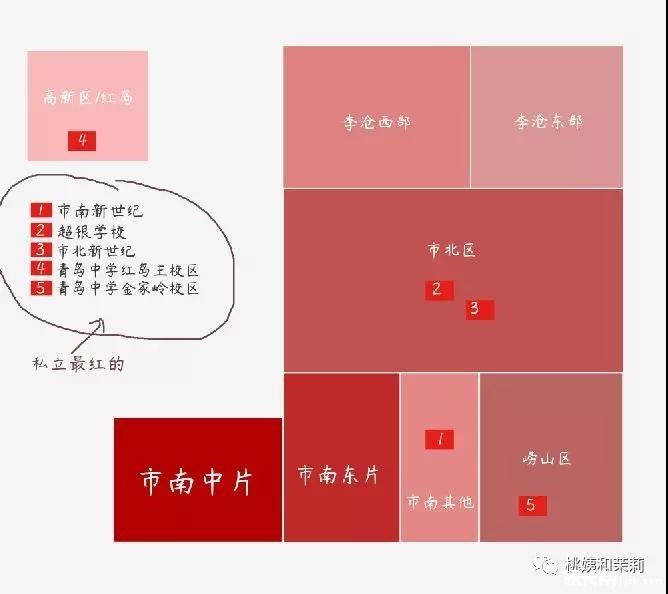 其余的区域,市南其他区、崂山区、市北区其他区,算是一个梯队,学校不会教坏孩子,但大部分区域内初中也过不了50%的平均普高率。李沧区啊红岛啊城阳啊就一言难尽了,有不少真的很不错的小学,但是,几乎找不出普高率过40%的初中……(这些学校的尖子生都去哪了?当然都去考私立初中了。)