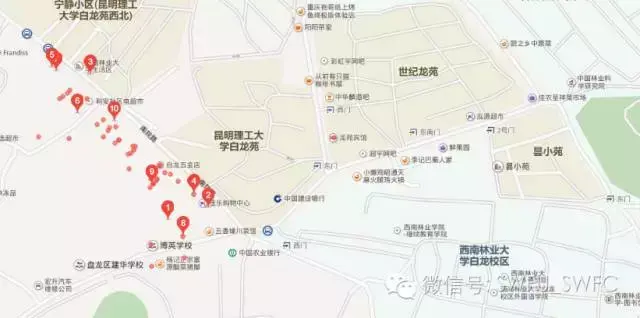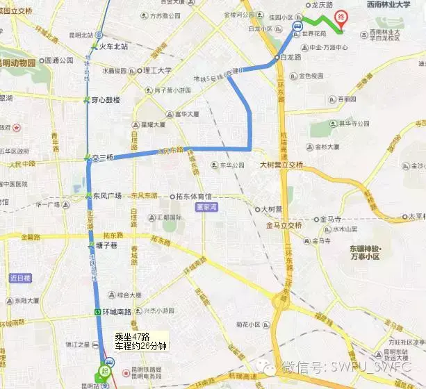 如果你是坐火车:当一大群人裹挟着小swfuer以及家人往出口涌的时候,千万不要变得晕头转向了。出口直走到头,(不要理会那些跟你介绍旅游的!)左转!到昆明站正对着的北京路上,继续直走,在第一个路口(永平路)右转。会看到一个公交站,ok,只要做上47路,就等着到“龙华路口站”下车,原站台转55、70、75终点站就是西林啦~火车站打车到学校大概30左右。要打车记得多往前走一下,千万记得要求打表!!!