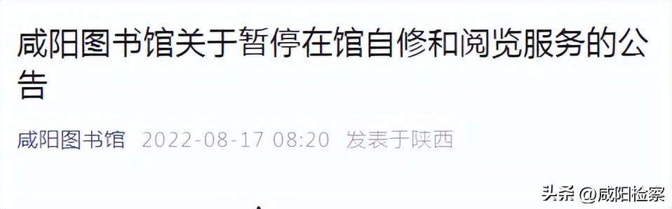 根据疫情防控形势需要,为保证广大读者健康安全,咸阳图书馆(含市民文化中心馆)自2022年8月17日起仅开放图书借还服务,暂停其它线下服务活动。恢复正常开放时间另行通知。