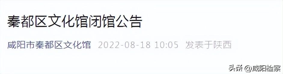 根据当前疫情防控形势,按照上级要求,为保障广大群众身体健康和生命安全,有效应对疫情传播风险,秦都区文化馆自即日起(2022年8月18日)闭馆,恢复开放时间另行通知。由此给您带来的不便,敬请谅解!