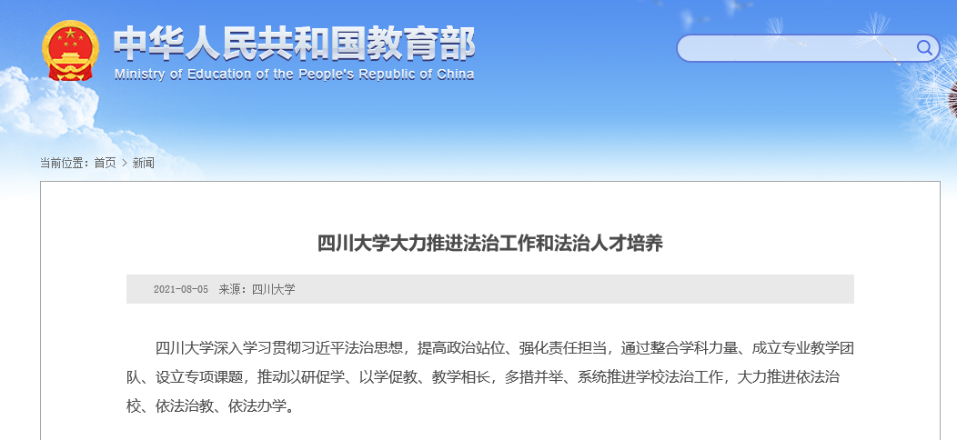8月5日,教育部官网以“四川大学大力推进法治工作和法治人才培养”为题,报道了学校通过整合学科力量、成立专业教学团队、设立专项课题,推动以研促学、以学促教、教学相长,多措并举、系统推进学校法治工作,大力推进依法治校、依法治教、依法办学。