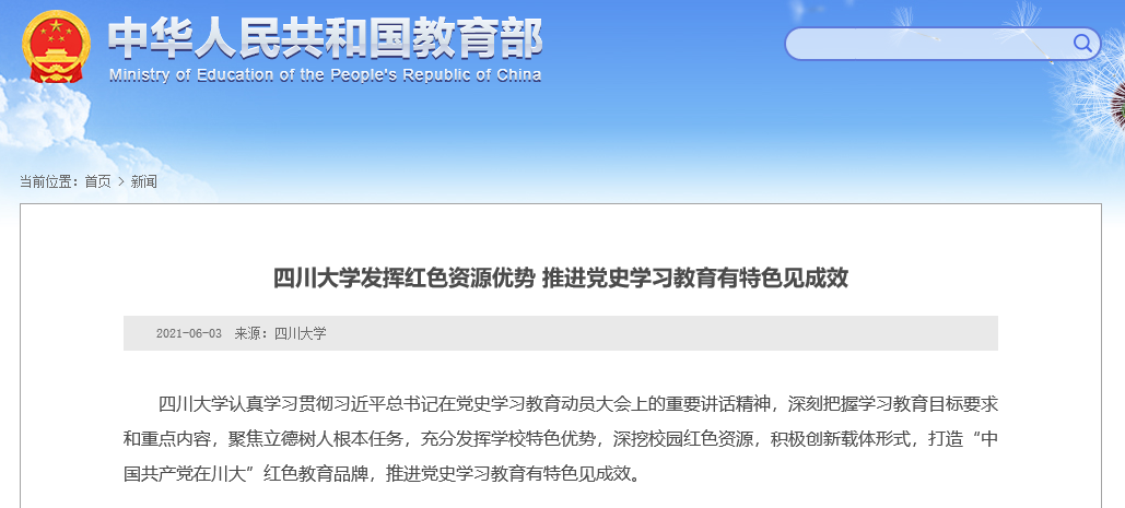 6月3日,教育部官网以“四川大学发挥红色资源优势 推进党史学习教育有特色见成效”为题报道川大党史学习教育活动。