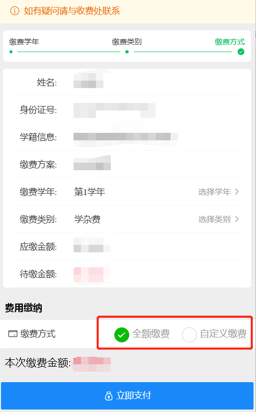 3、进入立即缴费页面后,可通过全额缴费和自定义缴费,两种方式进行缴费