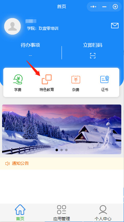 进入小程序后根据通知,可通过【特色教育】指引进行费用缴纳