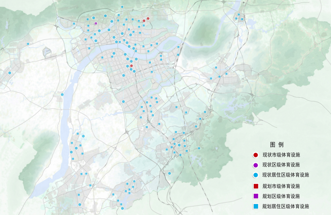 现状市级体育设施3处,区级体育设施1处,居住区级体育设施38处。
