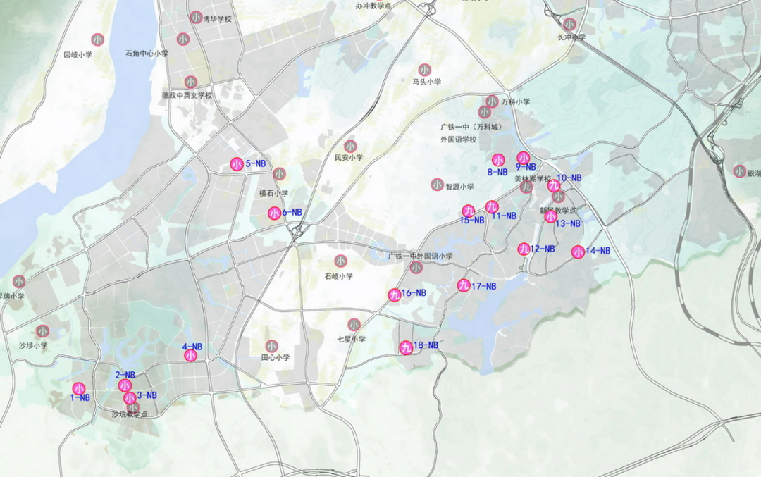 图例过大,这里截取了其中一部分,粉色的标识即规划学校,可以看到新规划的小学填补了清新区和清远南部等此前教育资源稀缺的地区。