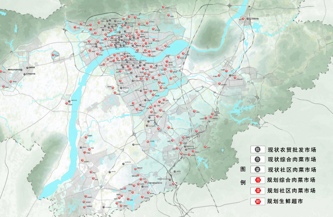 到规划期末,中心城区规划肉菜市场218处,其中农贸批发市场6处,综合肉菜市场53处,社区肉菜市场129处,生鲜超市30处。