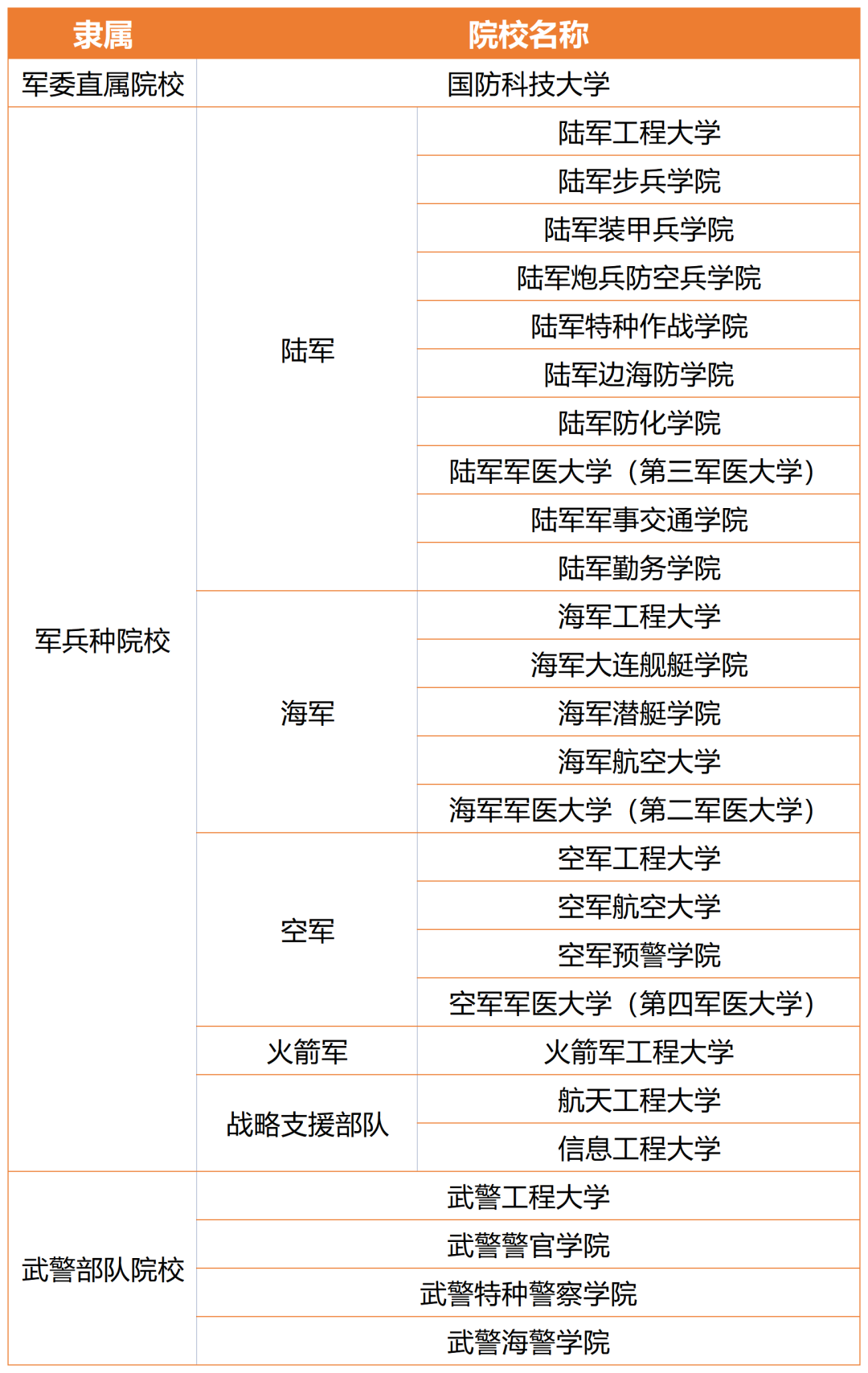 军校每年从部队和地方按比例招生,地方入校即入伍,享受军人待遇,在校期间一切学习生活费用由国家支付。平时穿着军装,佩戴学员红肩章。专科三年毕业后一般授少尉正排军衔,本科四年毕业后授中尉副连军衔。顺利毕业后将获得军士与学士学位,工作由学校根据专业和各大军区需要分配,去向涉及海陆空三军。军校不分一本,二本之类的,军校提前录取各地考生,分数线基本都在一本分数线以上。