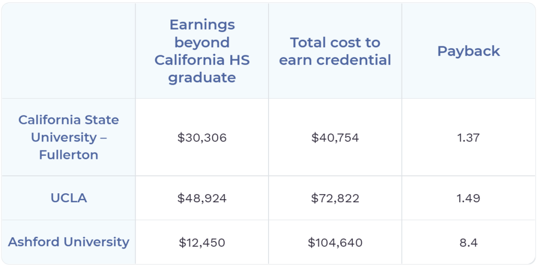 举个例子来说,一名就读于加州州立大学富勒顿分校的学生的回报是1.37年。对于加州大学洛杉矶分校(UCLA)的学生来说,这是1.49年。短期来看,加州州立大学貌似看着更好一些。