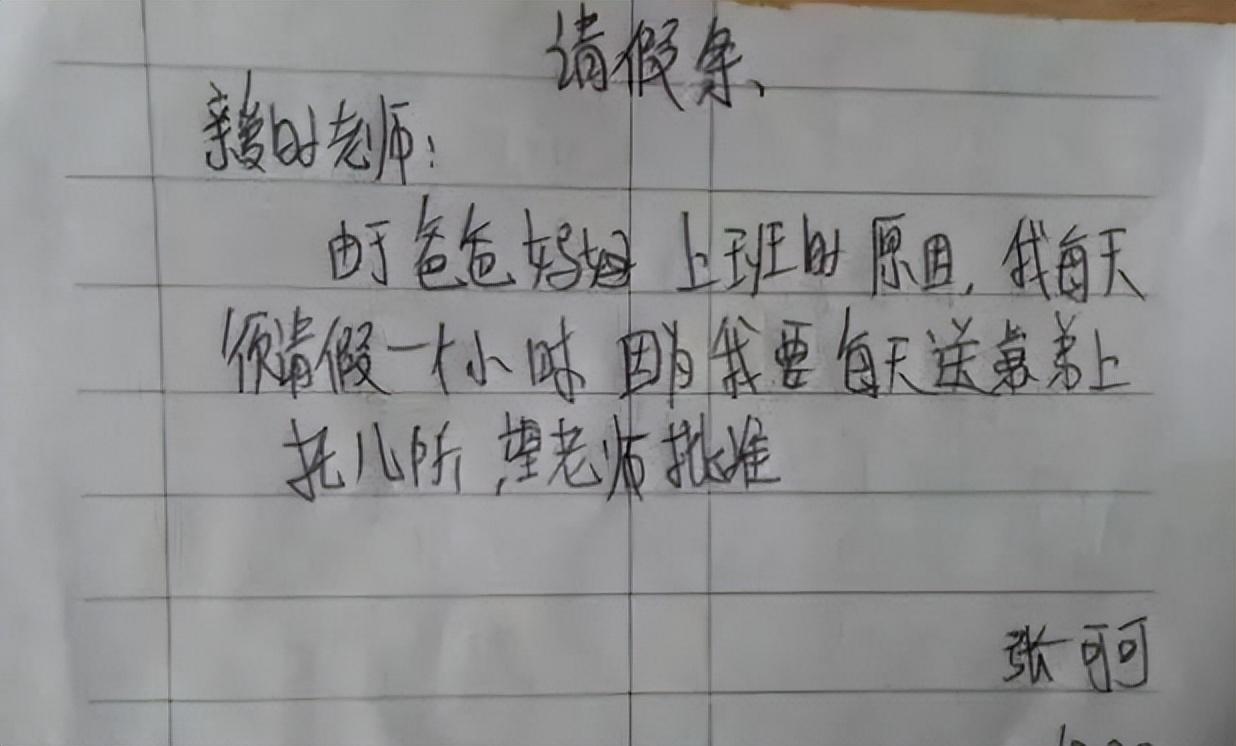 我们可以看到这名小学生写的请假条,亲爱的老师,因为家长上班的原因,自己需要每天请假一个小时送弟弟去上学,希望老师能批准,当老师在看到这个请假条的时候,理由非常合理,跟本就没有理由拒绝,但是仔细一想,家长怎么可能会让小学生送弟弟上学呢?一看就是学生不想上学找的借口。
