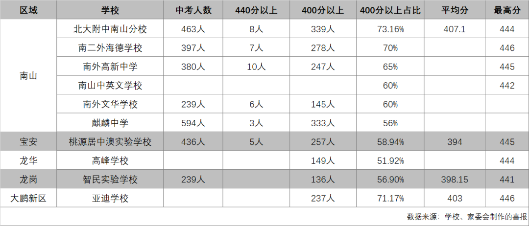 在这份汇总资料里,@深圳买房计划发现,成绩在400分以上的考生占比超过一半的学校有10所,TOP3分别是: