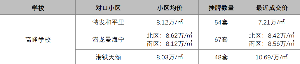 高峰学校所在的片区农民房扎堆,对口的商品房小区包括:特发和平里、潜龙曼海宁、港铁天颂。