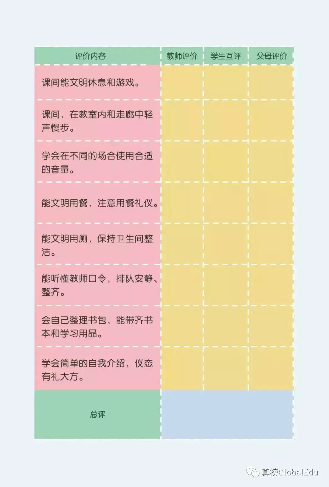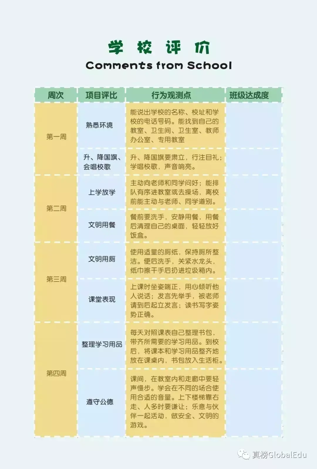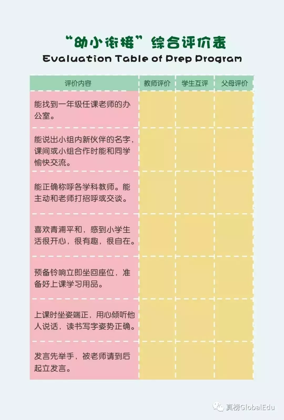 在评价体系方面也是尽可能的客观,注重过程性评价,真实反映学生的行为习惯和学习进展,从幼小衔接的评价体系上可以看出,学校设置教师评价、学生互评、父母评价、自我评价等,内容及评价体系多维度,非常尊重学生的个性差异。