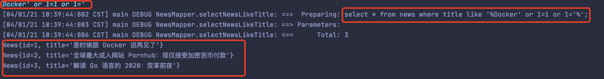 然后我写了一个控制台,接收输入的参数,传给 selectNewsLikeTitle,以便来尝试 SQL 注入。