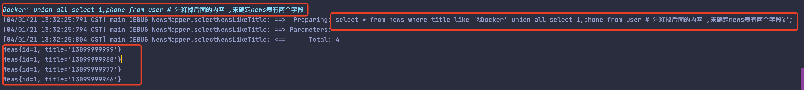 Docker' union all select 1,phone from user # 注释掉后面的内容 ,来确定news表有两个字段