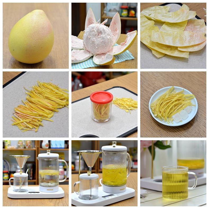 8. 艳丽的明黄色,过滤掉柚子皮丝,水倒入杯中即可趁温热饮。