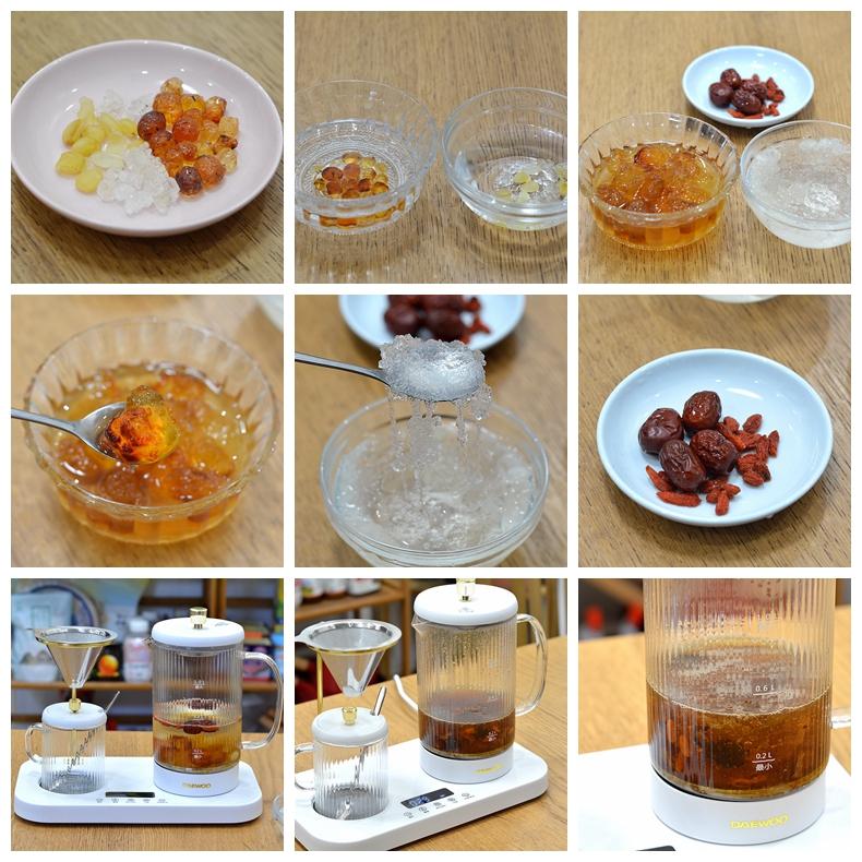 7. 桃胶、皂角米、红枣、枸杞、适量凉水同入养生壶中,选择“银耳”程序;