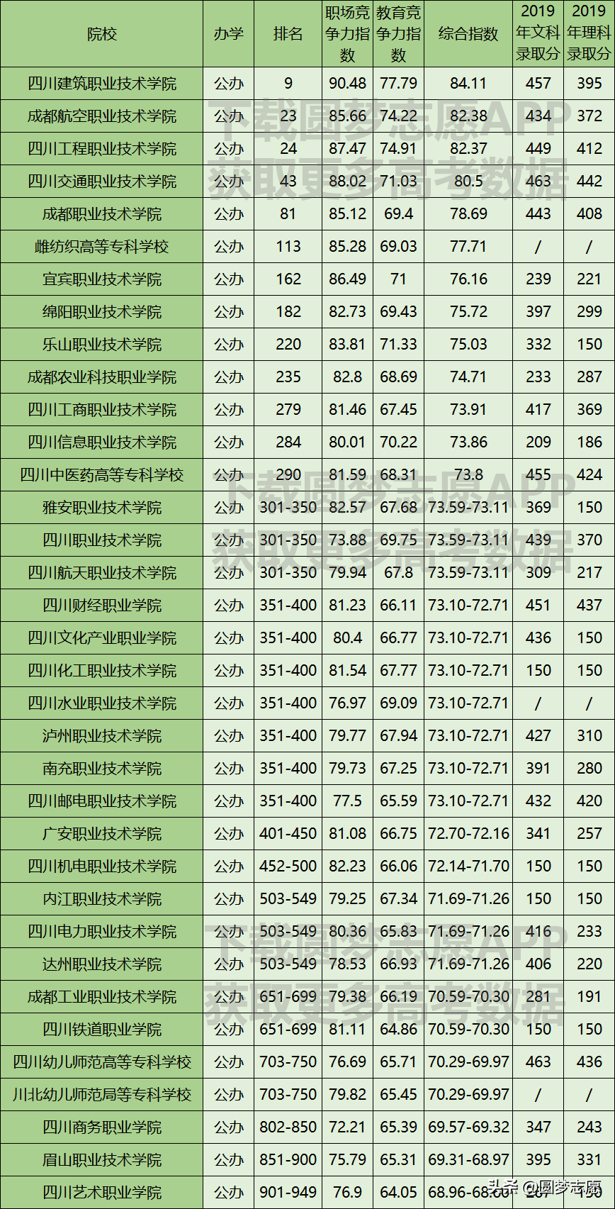 圆梦志愿为大家筛选了GDI高职高专排行TOP1000榜中所有位于四川省的专科院校,并为大家整理了这些学校2019年在四川省的文理科录取分数线,供考生和家长参考。