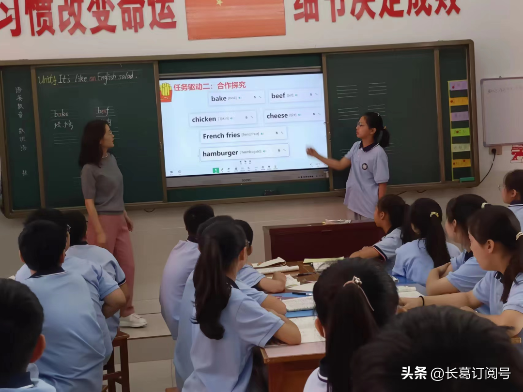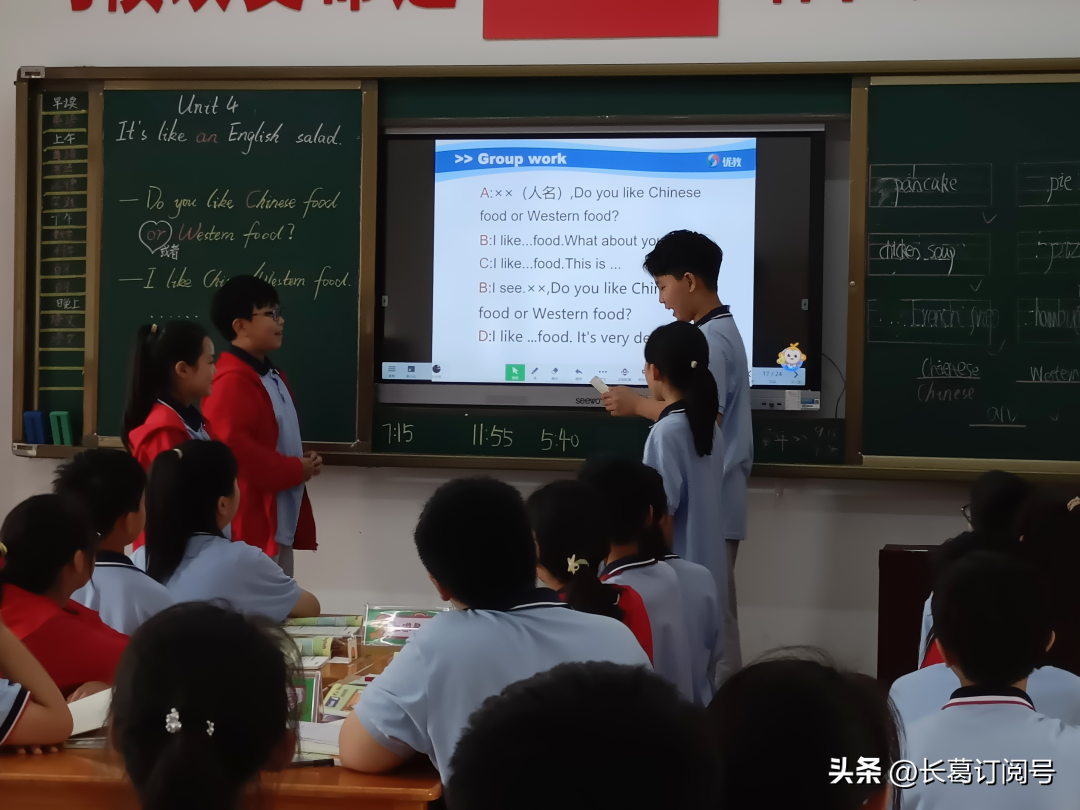 伊伟思老师的Unit4 It’s like an English salad.一课,第一部分是语篇对话,伊老师以本单元的插图封面导入,通过问题设置,启发学生思考,展开语篇对话的学习环节。先由重点句子在小组中个人学习,再轮流表达训练,再进行小组之间的竞争比拼,小组成员熟练展示,整堂课把小组合作学习、学生自主训练贯彻始终,凸显了研究的主题,达到了预期的效果。