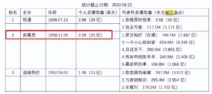 很快,就有人统计了关于女演员作品外网播放量的数据,赵露思的播放量高达25亿,比当红女星迪丽热巴还高出一倍。