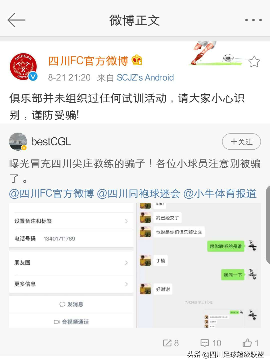 四川FC:俱乐部并未组织过任何试训活动,请大家小心识别,谨防受骗!(新闻及图片来源:懂球帝)