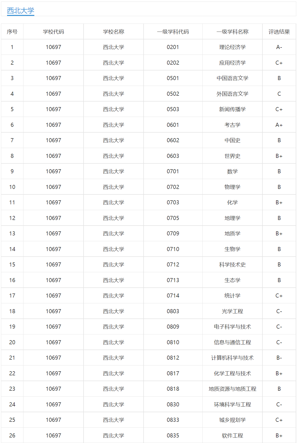 按照本轮学科评估实行的“学科整体水平得分”位次百分位,考古学、地质学、理论经济学、科学技术史、世界史、地质资源与地质工程、地理学、化学工程与技术、化学、软件工程、中国史、生态学、物理学、中国语言文学、生物学、数学16个学科进入前30%。特别值得一提的是,西北大学参评的26个学科全部上榜。