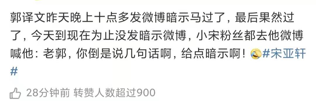 由于导演郭译文暗示过宋亚轩的队友马嘉祺取得理想成绩的消息,并最终得到验证,不少粉丝发声希望他也能对宋亚轩的高考成绩是好是坏予以点暗示。